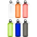 Ø 7 x 23 cm. Capacidad 600 ml. Material PET. Botella de plástico de colores translúcidos. Tapa a rosca en color negro con anillo de silicona y mosquetón de aluminio plata. Ultra liviana, pesa 60g.
