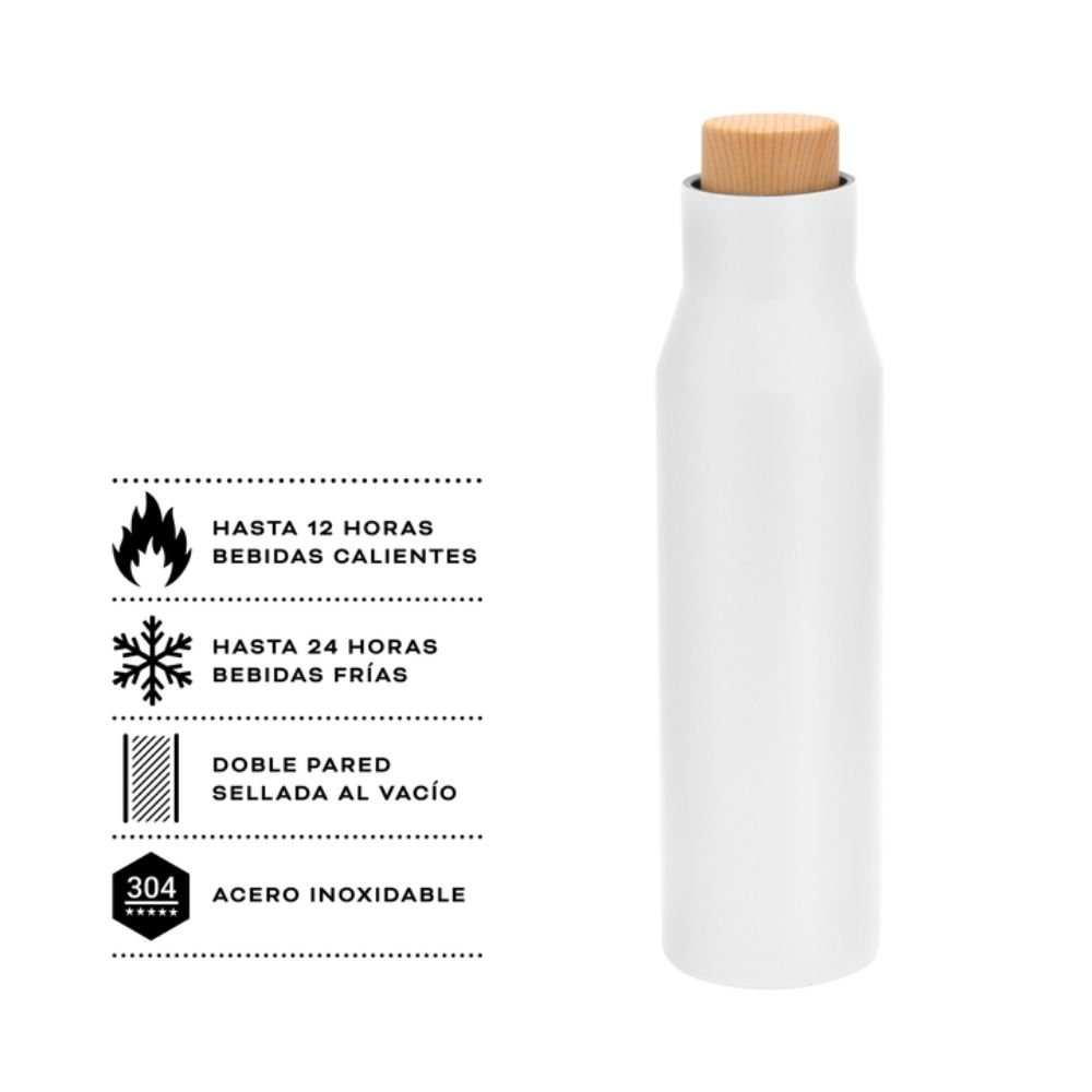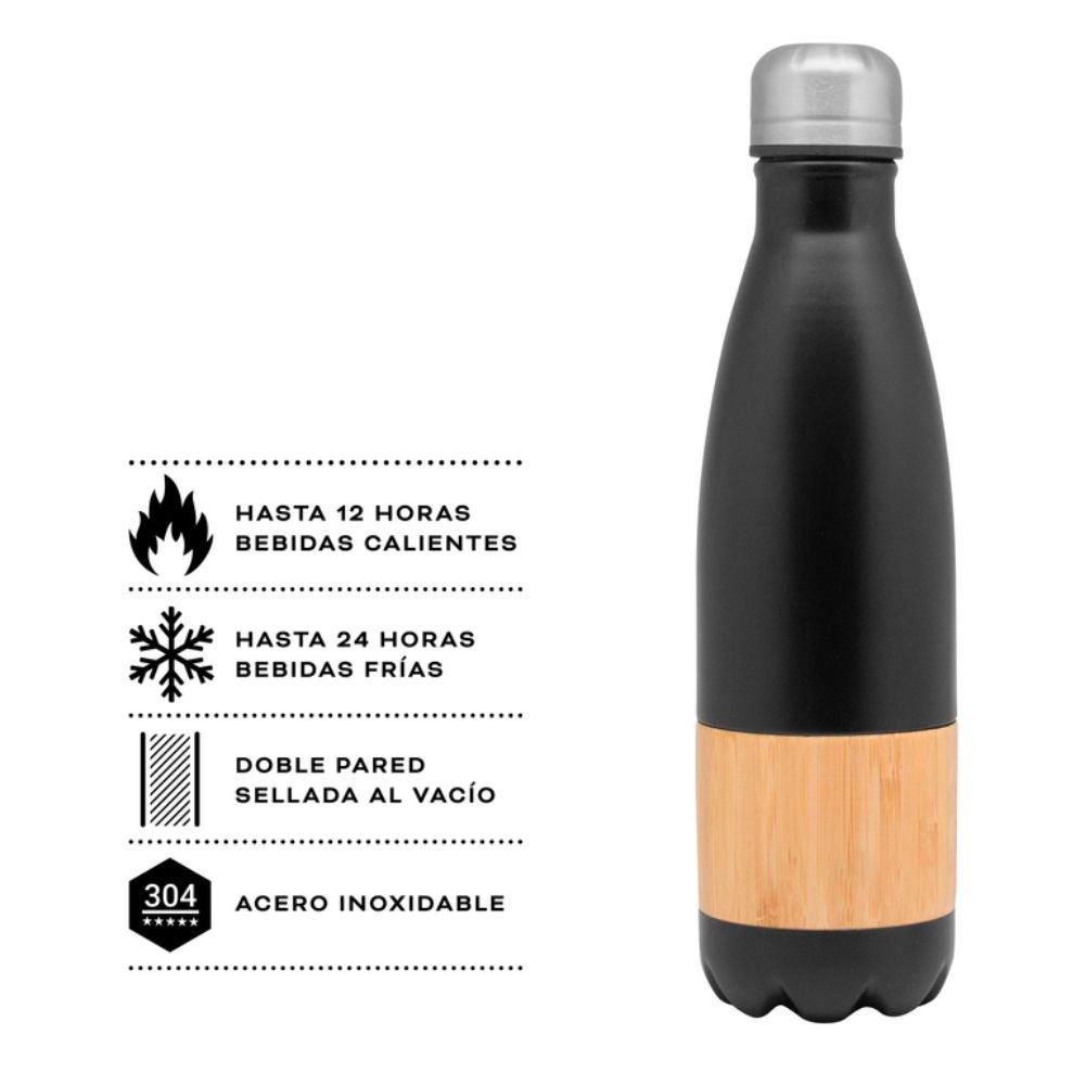 $ 7.540 + IVABotella térmica de doble pared sellada al vacío, con interior de acero inoxidable 304 y exterior de acero 201 con detalles de bambú. Tapa de acero. Capacidad de 500 ml. Medidas Ø 7,4 x 26,8 cm. Mantiene la temperatura de las bebidas calientes hasta 12 horas y frías hasta 24 horas. Presentación en caja de regalo kraft.