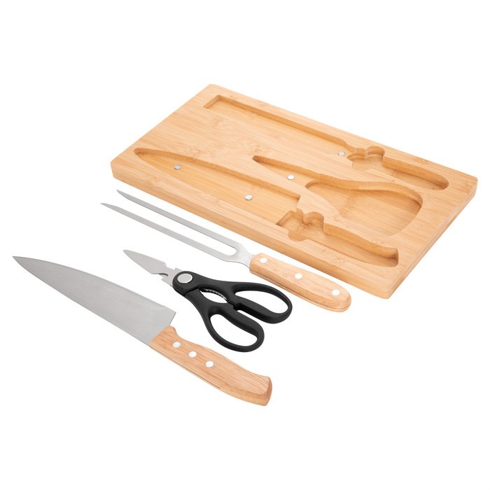 $ 11.450 + IVAEl detalle que se luce en cada asado, este set incluye una tabla de corte de bambú con imán para fijar tres utensilios esenciales: tijera de cocina multiuso de acero con mango plástico, ideal para cortar aves, pescados, vegetales y hierbas, además con abridor de botellas y rompenueces; cuchillo chef de acero con mango de madera; y tenedor de acero con mango de madera. Las medidas de los utensilios son: tijera 19,5 x 8,5 cm (73 g), cuchillo 33,5 x 4,5 cm (107 g) y tenedor 30,5 x 3 cm (84 g). Fabricado con materiales de calidad como bambú, imán, acero inoxidable 420, madera y plástico, este set combina funcionalidad, durabilidad y estilo, convirtiéndose en el accesorio perfecto para cualquier asado.