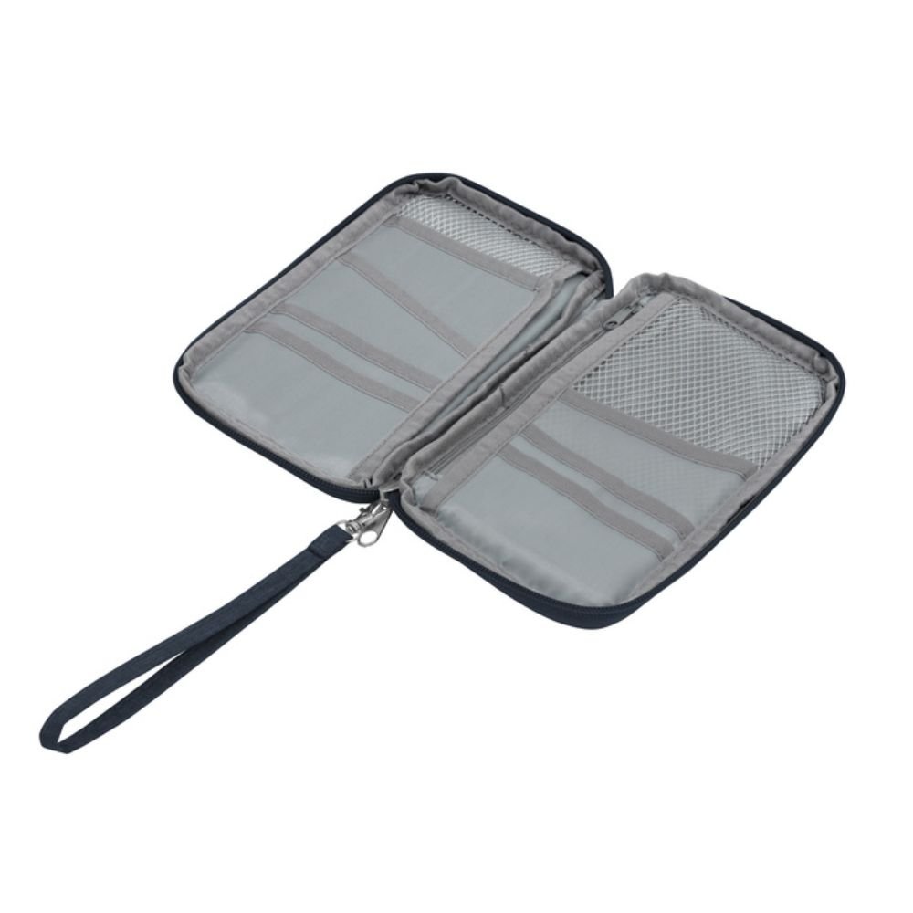 Billetera porta documentos compacta y funcional, diseñada con una estructura acolchada y cierre perimetral para mayor seguridad. En el frente cuenta con un práctico bolsillo exterior, mientras que en su interior presenta bolsillos de red a ambos lados, múltiples compartimentos organizadores y un bolsillo con cierre. Incluye una correa desmontable de poliéster con mosquetón y tirador metálico. Está fabricada en poliéster 300D con interior forrado en 210D. Medidas: 11 x 20 x 2 cm.