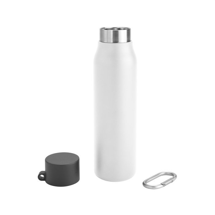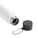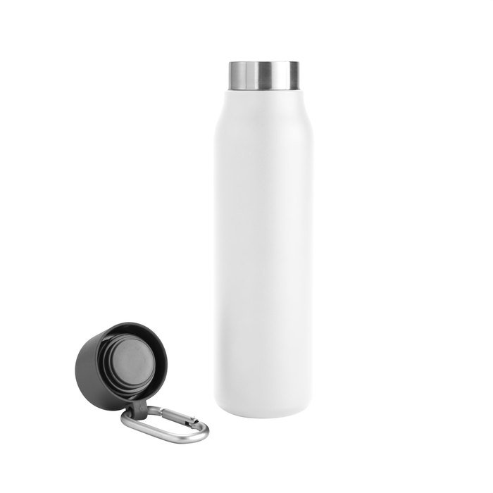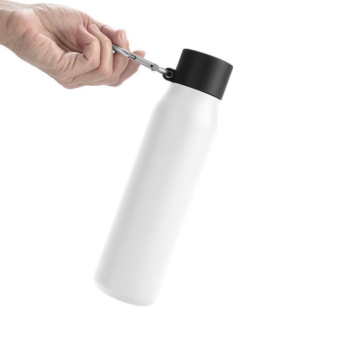Cuenta con tapa plástica de polipropileno, anillo de silicona y mosquetón de aluminio. Mantiene la temperatura de las bebidas calientes hasta 12 horas y frías hasta 24 horas.
