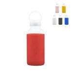 Botella de vidrio de borosilicato con capacidad de 350 ml. Medidas Ø 6,5 x 20 cm. Incluye tapa a rosca antiderrame con manija de agarre, pico ancho y manga de silicona antideslizante en varios colores. Presentación en caja de regalo.
