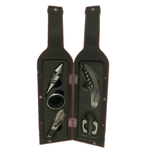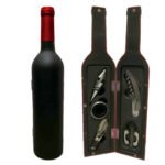 Original set de vino presentado en elegante estuche plástico brillante color rojo con diseño en forma de botella, ideal para regalo o promociones especiales. Incluye sacacorchos, anillo de vino, vertedor, tapón y cortador de láminas, combinando funcionalidad y estilo en cada accesorio. El sacacorchos, anillo y vertedor están fabricados en acero inoxidable; el tapón es de aleación de zinc cromado y el cortador de láminas combina ABS con acero inoxidable, garantizando resistencia y durabilidad. El estuche mide 7,5 x 7,5 x 32,5 cm y se presenta en caja de cartón negra.