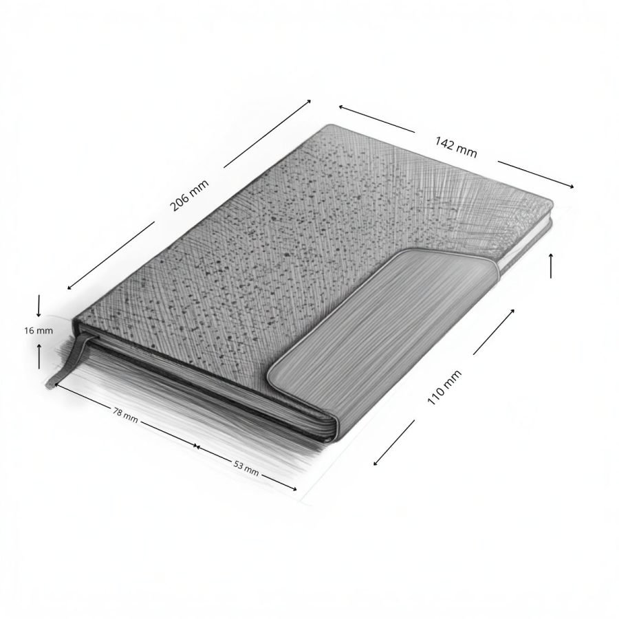 El Cuaderno Ecológico Noe combina materiales naturales con un diseño contemporáneo, ofreciendo una experiencia sensorial única al escribir, planificar o crear. Su tapa dura está elaborada con fibras de café recicladas fusionadas con detalles en PU, creando una textura rica y distintiva que refleja compromiso con la sostenibilidad. Con medidas de 142 × 206 × 16 mm, cuenta con 80 hojas punteadas en papel marfil y cinta marcadora en tono café, ideal para quienes buscan funcionalidad, estilo y un mensaje ambiental claro. Certificado RCS y presentado en bolsa de polipropileno orientado, es perfecto para personalización mediante grabado láser, convirtiéndose en una elección ideal para marcas que desean comunicar innovación ecológica y autenticidad.