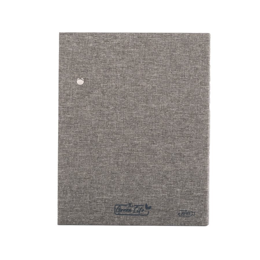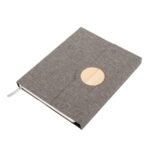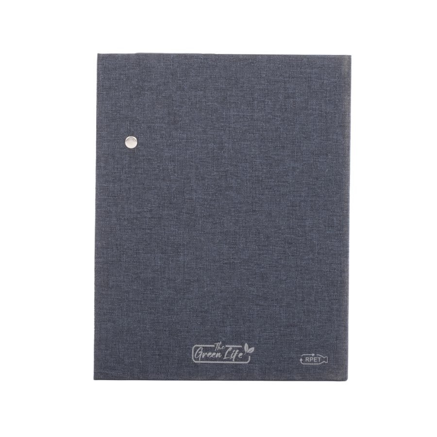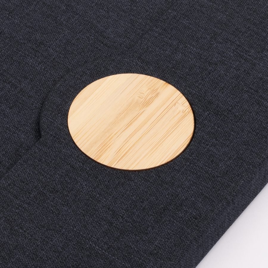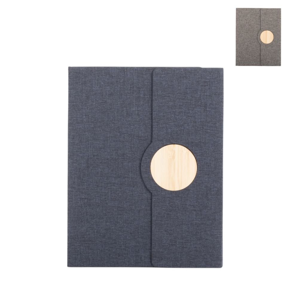 Cuaderno Ecológico Tainy combina elegancia moderna con sostenibilidad. Su cubierta de tela Oxford fabricada con botellas plásticas recicladas (RPET) y detalles en bambú natural en el cierre magnético crean un diseño funcional y responsable. Con 162 × 210 × 18 mm, incluye 80 hojas punteadas de papel marfil, cinta marcadora y soporte elástico para bolígrafo. Disponible en gris o azul, certificado FSC y RCS, y personalizable mediante grabado láser, es ideal para marcas que buscan unir utilidad y valores ambientales.