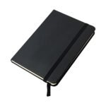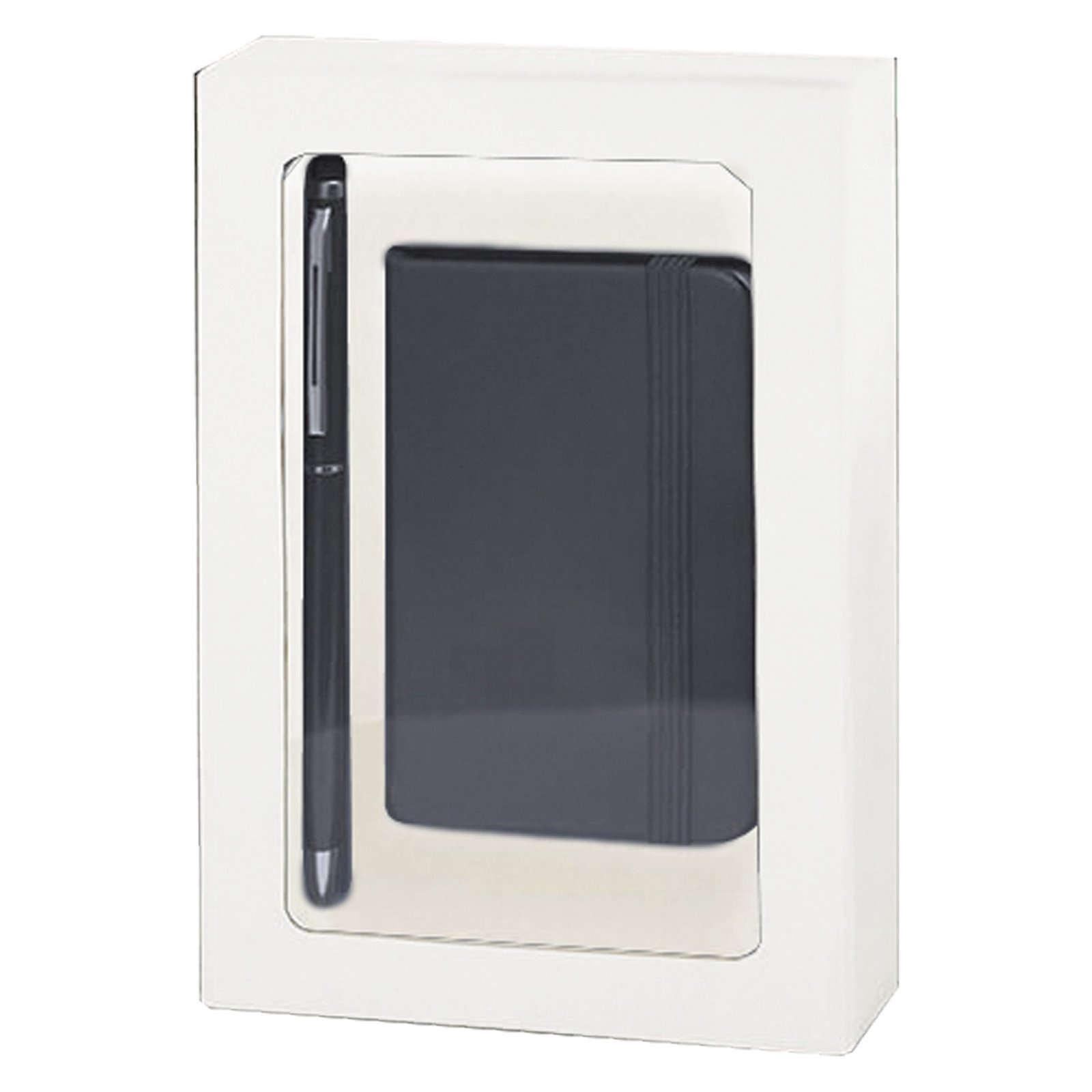 Elegante set de bloc de notas con tapas de suave tacto en polipiel, acompañado de bolígrafo de aluminio con puntero a juego, ideal para uso profesional o como regalo corporativo. La libreta cuenta con 80 hojas lisas, elástico de sujeción y marcapáginas de tela a juego, combinando funcionalidad y estilo. Presentado en sofisticado estuche de cartón con ventana y base de espuma troquelada, protege y exhibe el set de manera impecable. El bolígrafo con tinta azul mide 13,5 cm, mientras que la libreta mide 10 x 6,5 cm y la caja del set 17 x 11,4 x 2 cm. Color negro clásico.