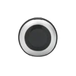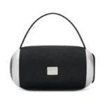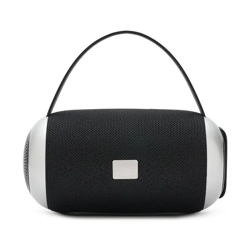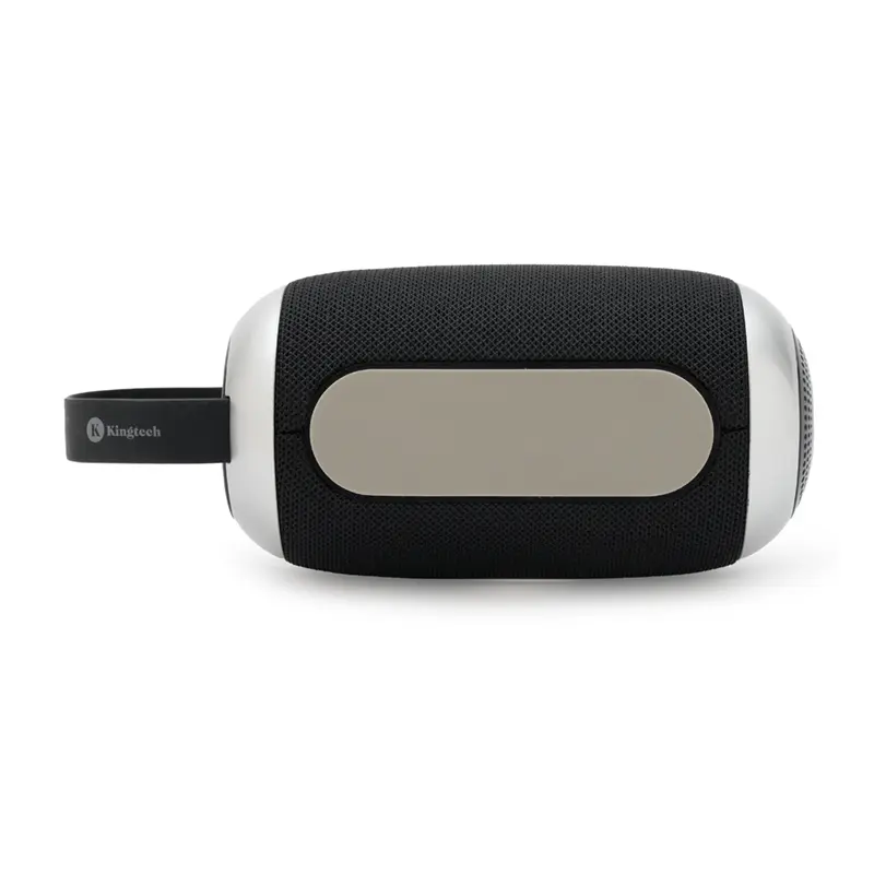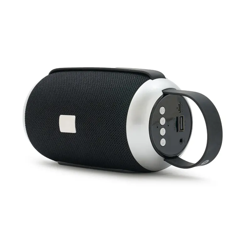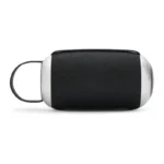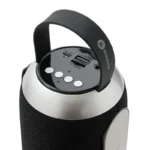 Descripción general del producto: Parlante portátil Bluetooth de color negro con detalles en gris. Cuenta con una correa de agarre y una base que proporciona un mejor apoyo y estabilidad al usarlo en diversas superficies.