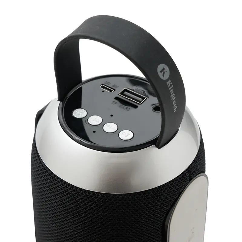 En el lado izquierdo del parlante, tiene el puerto de carga DC 5V, una ranura USB, una ranura TF, una entrada AUX, un interruptor de encendido, un botón de reinicio, un micrófono integrado y una luz indicadora de carga.