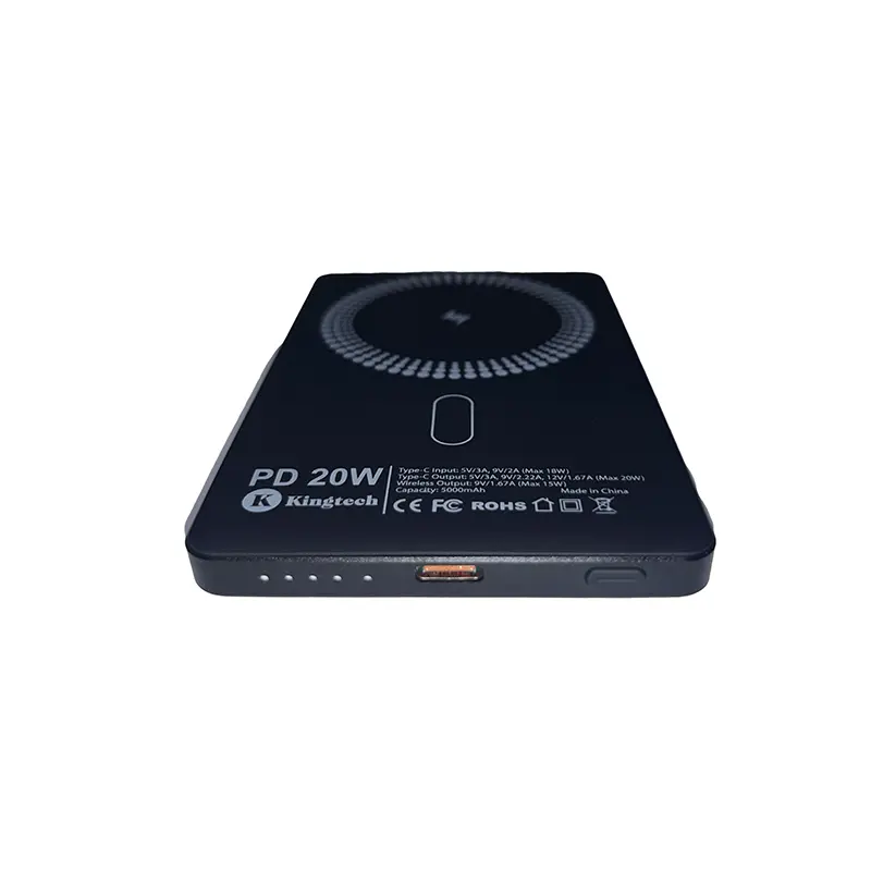 Cargador portátil ultradelgado fabricado en aluminio y ABS con batería de polímero de litio de 5.000 mAh, entrada y salida Tipo-C con carga rápida de hasta 20W y tecnología de carga inalámbrica de hasta 15W, compatible con múltiples dispositivos; incluye cable USB a Tipo-C y es ideal para usuarios modernos que buscan una solución versátil y veloz para cargar celulares y accesorios en movimiento sin necesidad de cables. Dimensiones: 10.3 × 6.5 × 0.8 cm. Peso: 115 g.