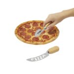 Un detalle único para sorprender, este set incluye dos utensilios esenciales para cortar pizzas con facilidad: un cuchillo curvo con hoja dentada y perforada para cortes limpios y precisos, y una cuchilla circular giratoria para un corte rápido y eficaz, ambos con mango de bambú. Presentado en caja de regalo kraft, combina diseño, funcionalidad y estilo. El cuchillo curvo mide 17,2 x 4 x 1,6 cm y la cuchilla giratoria 13,6 x 4,8 x 1,6 cm, fabricados en acero inoxidable 420 y bambú, garantizando durabilidad y resistencia. Métodos de impresión disponibles: tampografía, serigrafía y grabado en láser, perfectos para personalización y regalos corporativos.