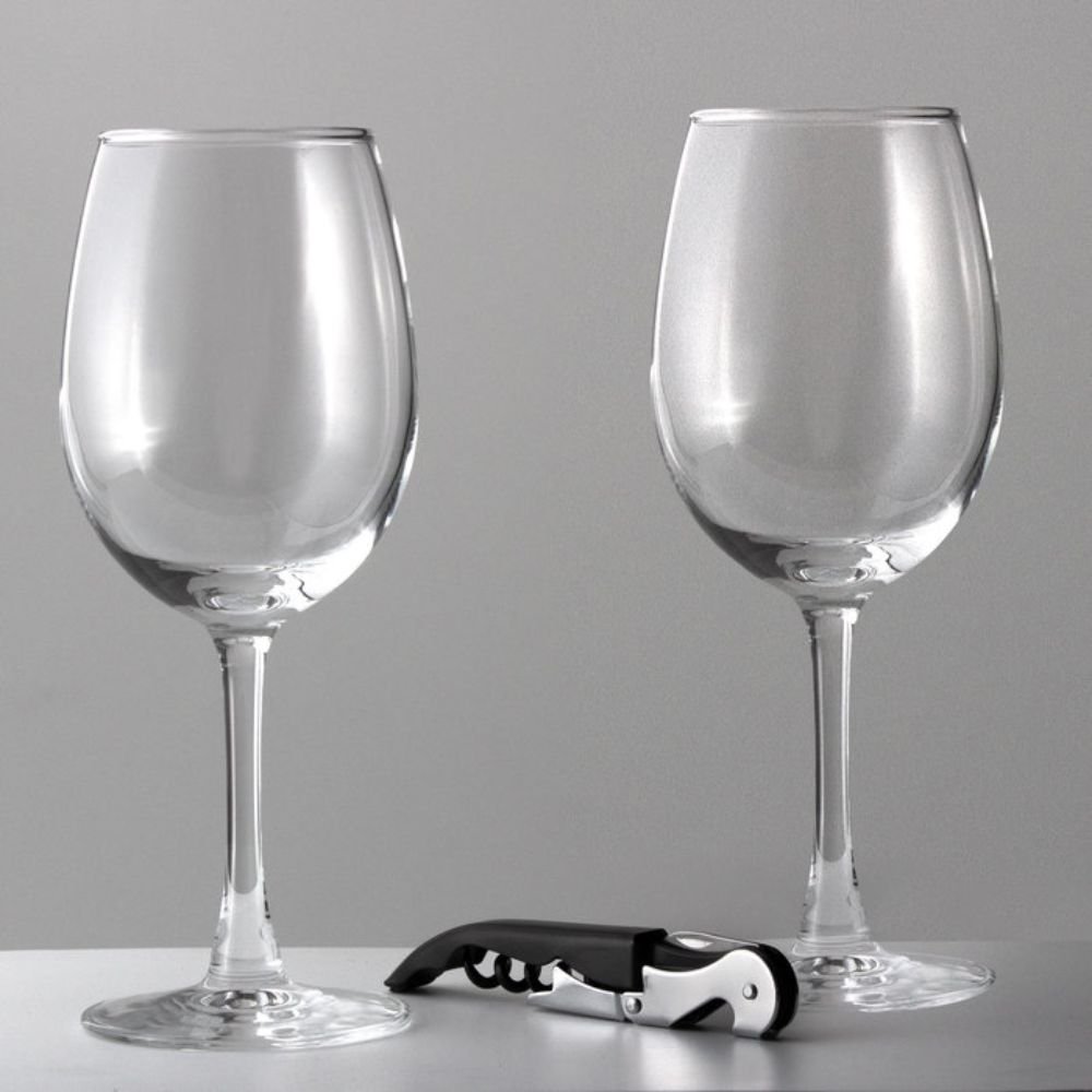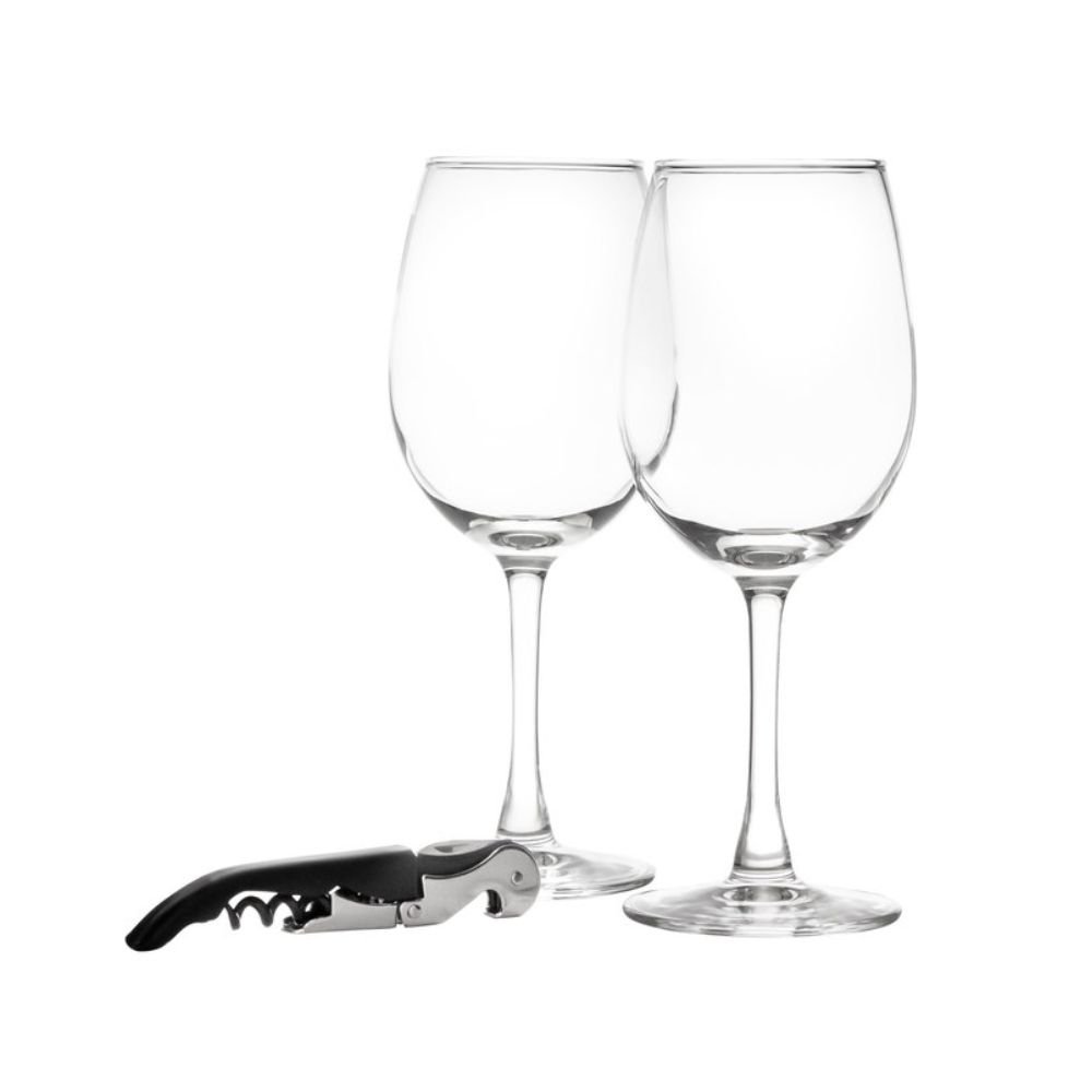 Set de vino elegante y funcional, ideal para compartir momentos especiales. Incluye dos copas de vidrio de 350 ml (Ø 7,4 x 20 cm) y un sacacorchos de acero inoxidable 430 con detalles en acero cromado y acabado negro mate. Las piezas se presentan sobre espuma protectora que asegura estabilidad durante el guardado y transporte. Perfecto para regalar, transportar o usar en catas y reuniones. Presentación en caja de regalo kraft.