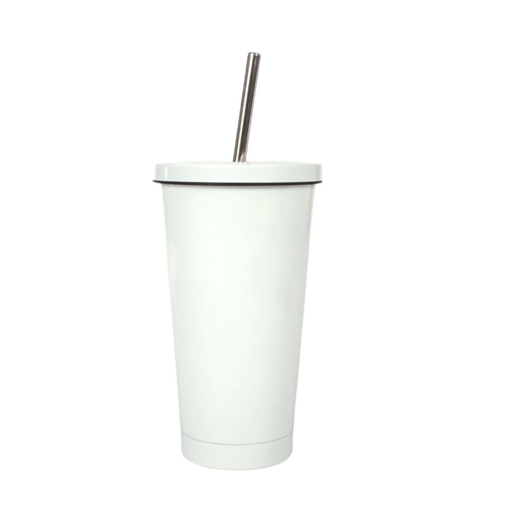 Vaso blanco de Acero Inoxidable, doble pared aislante, con tapa rosca y bombilla de Acero Inoxidable, para Sublimación. Calidad superior. Capacidad 550cc (15oz). Presentación en bolsa blanca + estuche de cartón blanco.