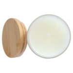 Vela aromática de 8oz en envase redondo de vidrio empavonado con tapa de Bamboo. Aroma a Vainilla. Ideal para regalo de hogar y aromaterapia. Amplia superficie de impresión de logo.