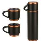 Termo de acero inoxidable color negro con tapa-taza de rosca que incluye 3 tazas. Presentado en caja de cartón negra con bolsa plástica e incluye bolso transportable. Ideal para líquidos calientes o fríos (no apto para lácteos o bebidas gaseosas). Medidas: termo Ø6,5 x 34,5 cm, tazas Ø5,8 x 6,7 cm, caja 26,5 x 18,5 cm. Capacidad de 500 ml. Interior en acero inoxidable SS 304 y exterior en SS 204.