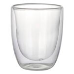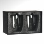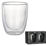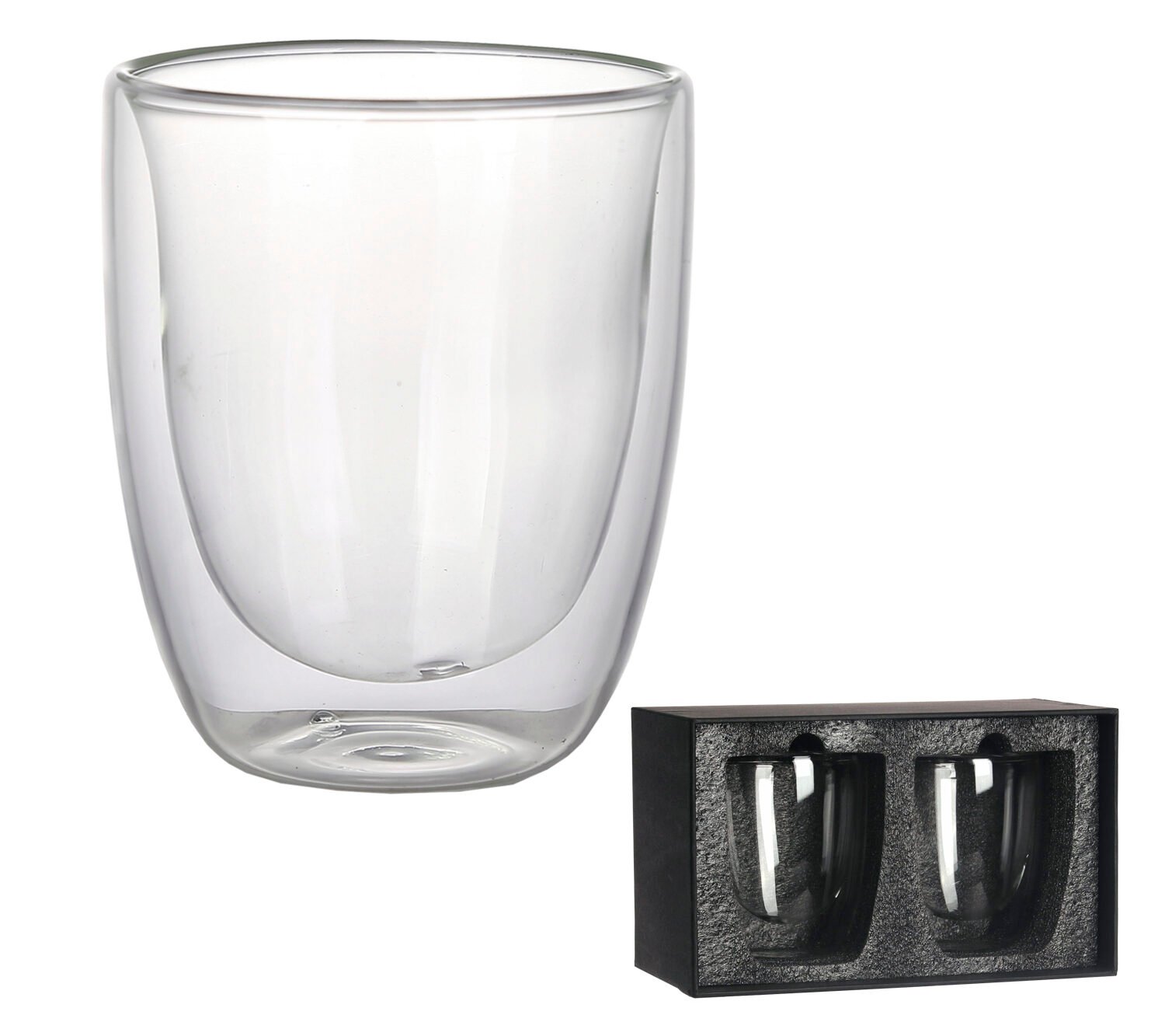 Set de 2 vasos fabricados en vidrio borosilicato de doble capa, ideales para mantener la temperatura de las bebidas y evitar la condensación exterior. Cada vaso tiene una capacidad de 280 ml y mide Ø 8,3 cm x 10,2 cm. El set se presenta en una elegante caja de regalo negra con interior de cuna de polímero de polietileno negro. Tamaño del estuche: 22,9 cm x 14,2 cm x 12,3 cm