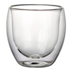 Set de 2 vasos de vidrio borosilicato de doble capa, diseñados para conservar la temperatura de las bebidas sin generar condensación en el exterior. Cada vaso tiene una capacidad de 200 ml y mide Ø 8 cm x 8 cm. El set se presenta en una elegante caja de regalo negra con interior de cuna de polímero de polietileno negro. Tamaño del estuche: 21,7 cm x 12,2 cm x 11,8 cm.