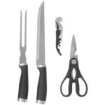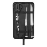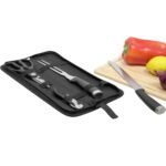 Este completo set de asado es ideal para los amantes del buen BBQ. Viene en un estuche compacto con cierre, de 36 x 9,5 x 3 cm, que contiene todo lo necesario: tenedor, cuchilla, asador, además de tijera y destapador de vino, todos con mango negro ergonómico. Fabricados en acero inoxidable, polipropileno y nylon, los utensilios combinan resistencia y funcionalidad para cualquier ocasión al aire libre o parrillada en casa.