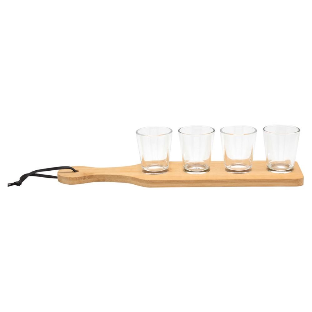 Set de 4 vasos tequileros presentado en una elegante bandeja de bambú con tira símil cuero, ideal para celebraciones y ocasiones especiales. Los vasos, de Ø 5 x 6 cm, están fabricados en vidrio transparente, ofreciendo una presentación cuidada y uniforme. La base de bambú (33 x 8 x 1 cm) aporta un toque natural y sofisticado. Un set funcional y decorativo, perfecto para regalar o incorporar en barras y reuniones. Presentación en caja de regalo kraft.
