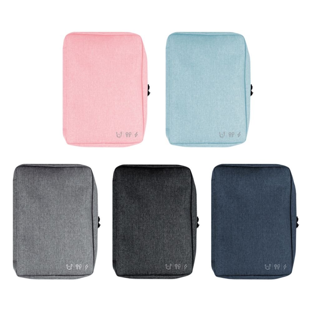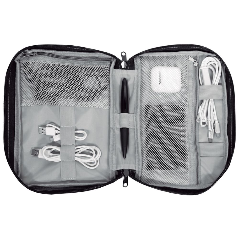 Organizador de cables Diana, diseñado para mantener en orden tus cables y accesorios con total practicidad. Fabricado en poliéster, cuenta con dos bolsillos de red con cierre para almacenamiento seguro. Incluye cuatro elásticos para enrollar cables, un elástico porta bolígrafo y dos elásticos amplios para mayor organización. Disponible en colores celeste, azul y gris. Medidas: 19 x 26 x 5 cm. No incluye accesorios.