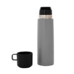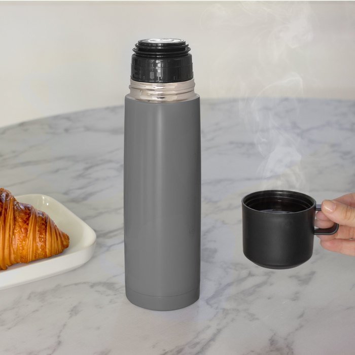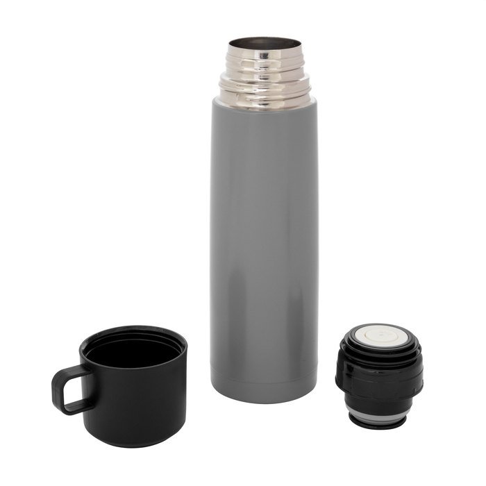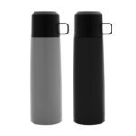 Termo con doble pared sellada al vacío y tecnología vacuum, ideal para mantener bebidas calientes hasta 6 horas y frías hasta 12. Fabricado con interior de acero inoxidable 304 y exterior de acero 201, con acabado mate. Incluye tapa y taza plásticas en color negro. Capacidad: 500 ml. Medidas: Ø 7 x 24 cm. Presentación en caja de regalo Kraft.