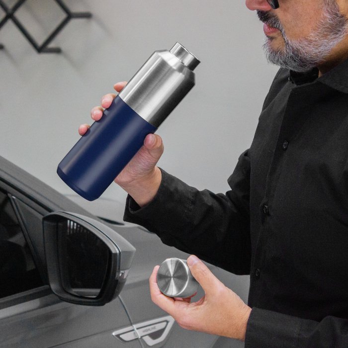 Botella térmica con doble pared sellada al vacío, ideal para conservar bebidas calientes por más de 12 horas y frías hasta 24. Fabricada con interior de acero inoxidable 304 y exterior de acero 201. Cuenta con tapa a rosca de acero 201 con anillo de silicona, y pintura con acabado mate en la parte inferior. Capacidad: 600 ml. Medidas: Ø 7 cm x 24,5 cm. Presentación en caja de regalo kraft.