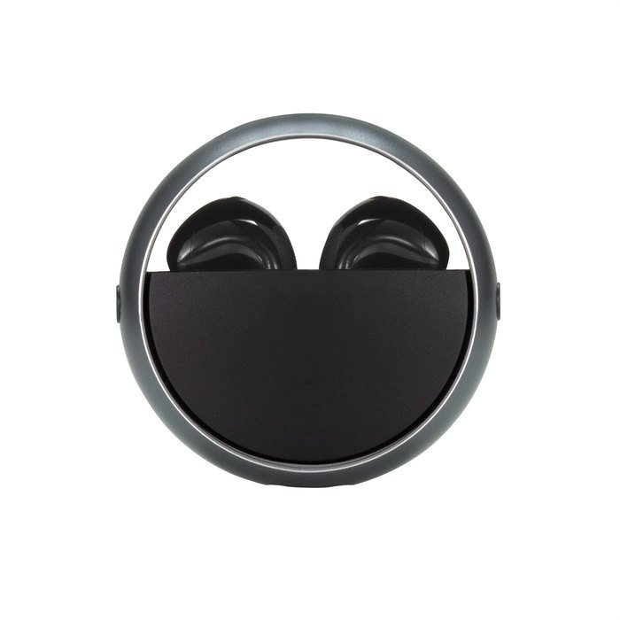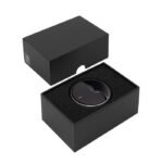 Medidas del estuche: Ø 5 cm x 1,8 cm. Materiales: Plástico ABS y aluminio. Presentación en caja de regalo negro mate.