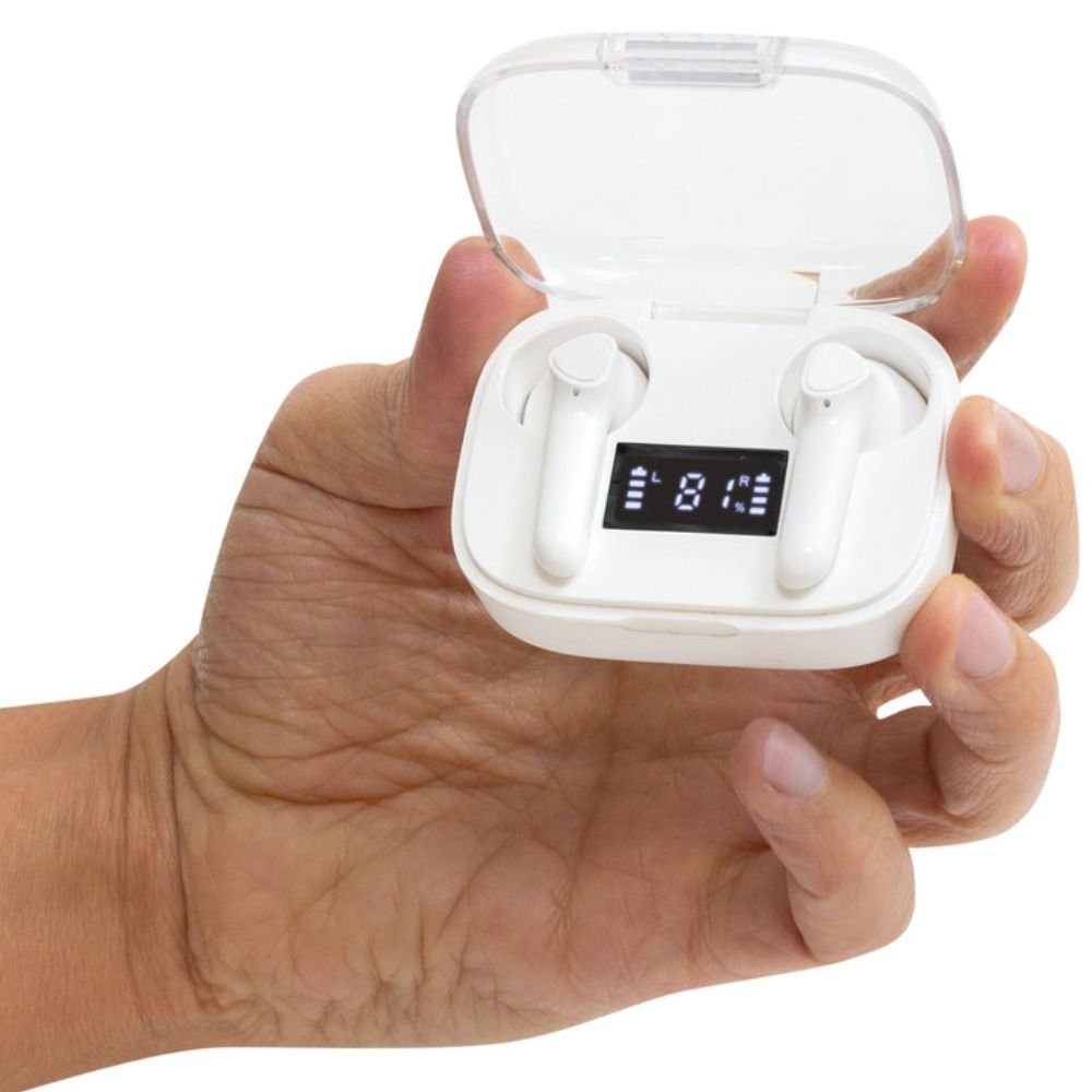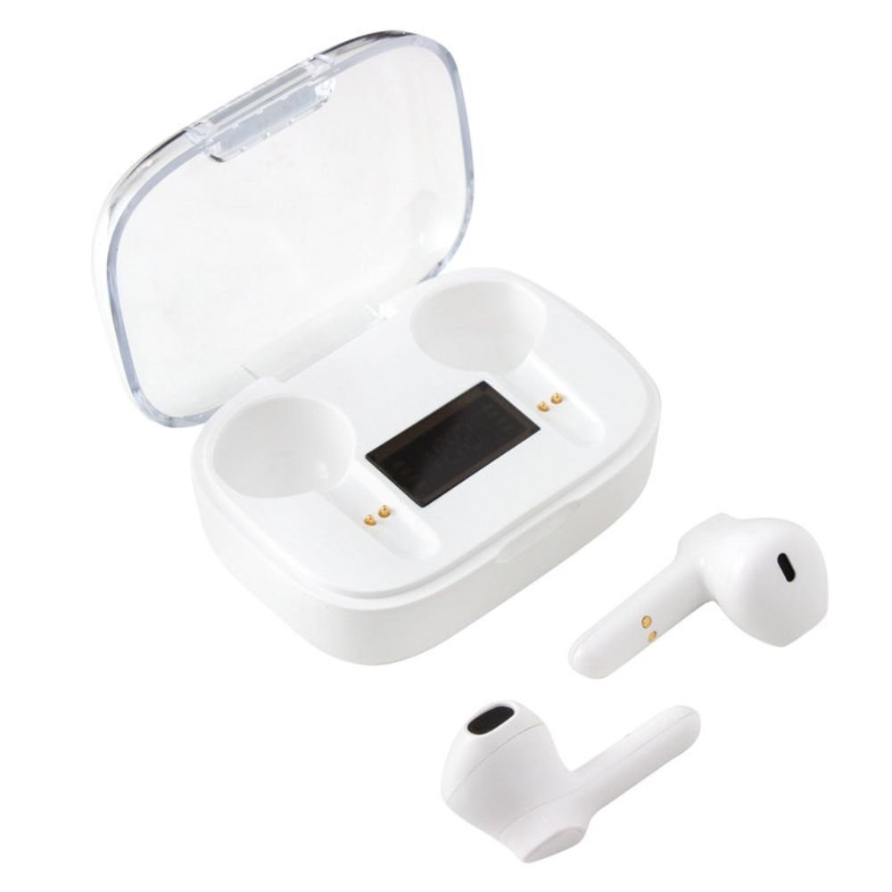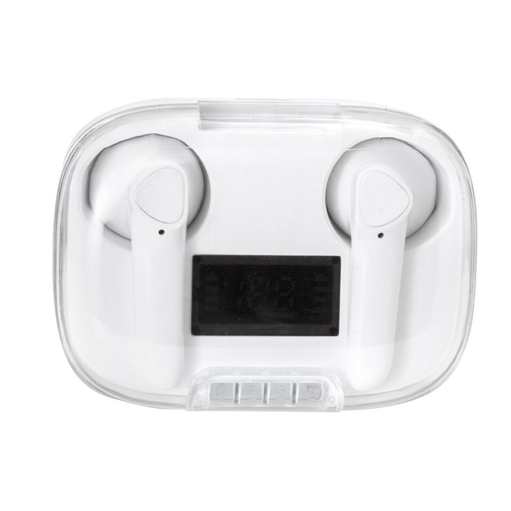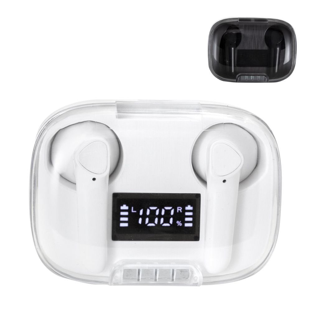 Auriculares Bluetooth inalámbricos fabricados en plástico ABS, con tecnología Bluetooth 5.1 y estuche de carga con pantalla digital y tapa transparente. Ofrecen una autonomía de reproducción de 3 horas y alcance de hasta 15 metros. Cada auricular tiene una batería de 30 mAh, y la caja de carga, 250 mAh. Incluye cable USB tipo C (blanco o negro según el color del producto). Presentación en caja de regalo mate, a tono con el color de los auriculares.