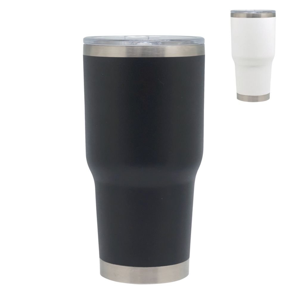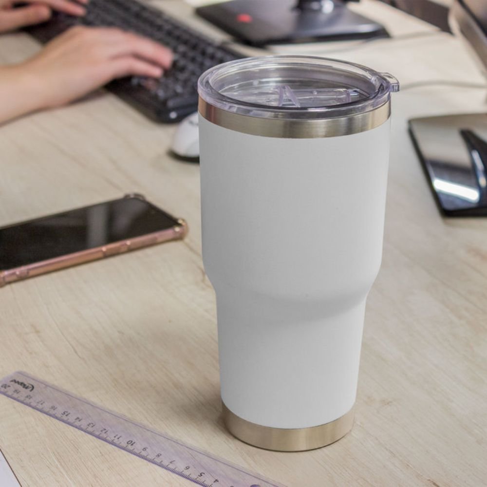 Mug térmico de gran capacidad (850 ml), con doble pared sellada al vacío y tecnología Vacuum que mantiene tus bebidas frías o calientes por más tiempo. Interior de acero inoxidable 304 y exterior de acero 201 con pintura Powder Coat, resistente a la corrosión. Incluye tapa plástica transparente con anillo de silicona. Presentación en caja de regalo.