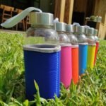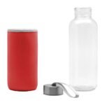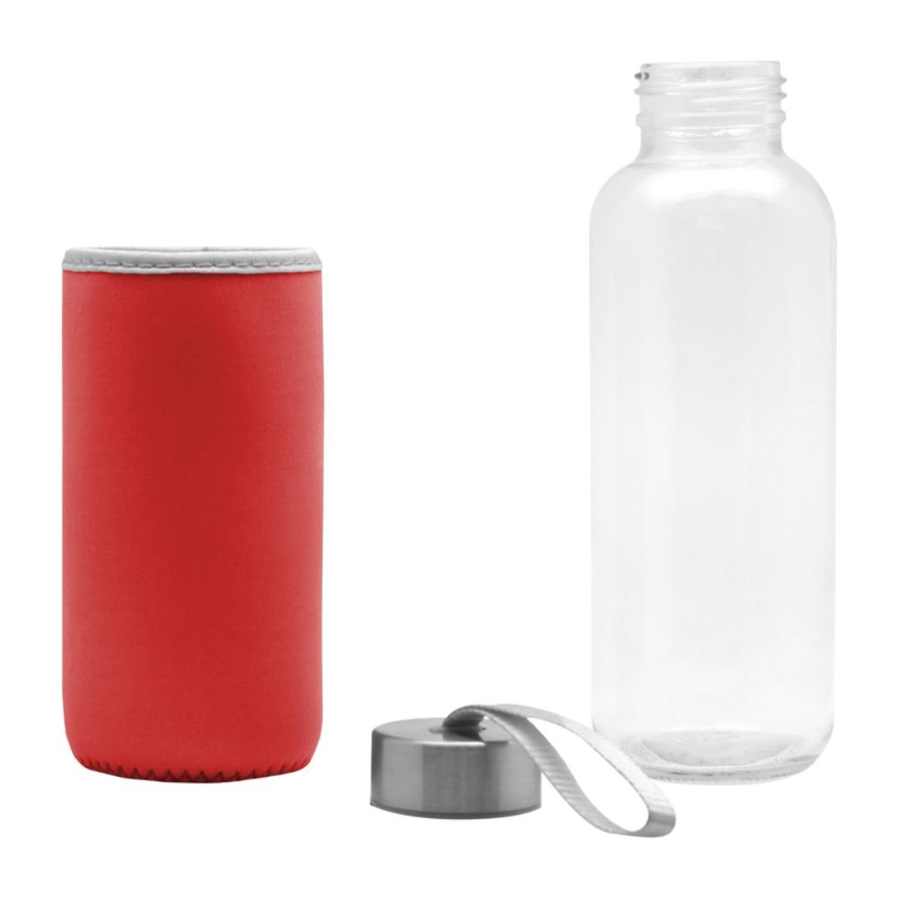 Botella de vidrio translúcido con capacidad de 440 ml, ideal para bebidas frías o calientes. Incluye funda de neopreno que protege y ayuda a conservar la temperatura, y tapa de acero inoxidable con tira de tela para fácil transporte. La botella es apta para microondas y lavavajillas (excepto tapa y funda). Presentación en caja de regalo.