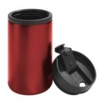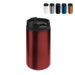 Mug doble pared con interior de plástico y exterior de acero inoxidable. Tapa a rosca plástica de color negro con cierre a presión antiderrame. Base antideslizante. Capacidad de 290 ml. Medidas Ø 7 x 14 cm. Presentación en caja de regalo.