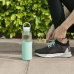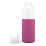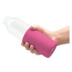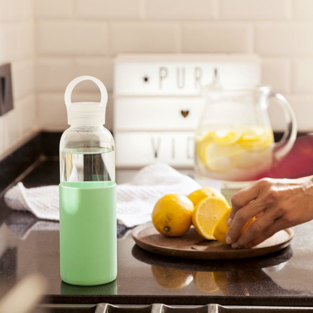 Botella de vidrio de borosilicato con capacidad de 500 ml. Medidas Ø 6,5 x 24 cm. Cuenta con tapa a rosca antiderrame con manija de agarre, pico ancho y manga de silicona antideslizante en varios colores. Presentación en caja de regalo.