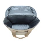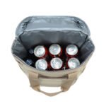 Mochila cooler térmica fabricada en resistente tela RPET reciclada con interior aislante de PEVA y acolchado de esponja PE FOAM, ideal para mantener alimentos y bebidas a la temperatura deseada. Con un tamaño de 29.5 por 40 por 13.5 centímetros y capacidad de 16 litros, incluye bolsillo delantero, dos bolsillos laterales, mango de mano y cierre con apertura de 240°, mientras que su base de nylon Ripstop impermeable color café garantiza durabilidad y protección en cualquier superficie. Disponible en color beige, combina funcionalidad, practicidad y sostenibilidad, siendo perfecta para picnics, salidas al aire libre o uso diario, y se presenta en bolsa plástica transparente con posibilidad de personalización mediante serigrafía o DTF.