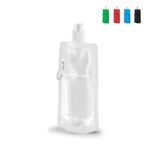Botella de 400 ml fabricado en PET con cuerpo flexible, disponible en colores azul, negro y transparente. Incorpora tapón de seguridad a rosca y práctico mosquetón metálico a juego que facilita su transporte. Su diseño ligero y funcional lo hace ideal para actividades deportivas, al aire libre o uso diario. Se presenta en bolsa plástica individual y cuenta con un tamaño de 11,5 x 26,5 cm. Botella elaborada en PS con tapa plástica resistente.