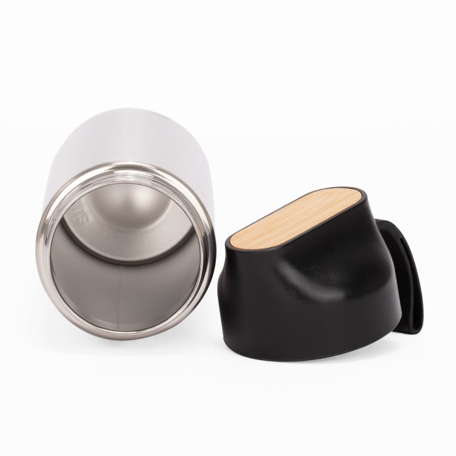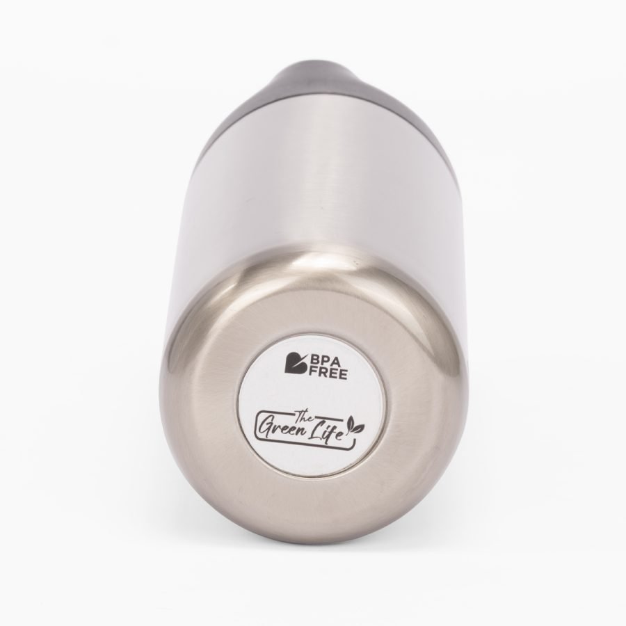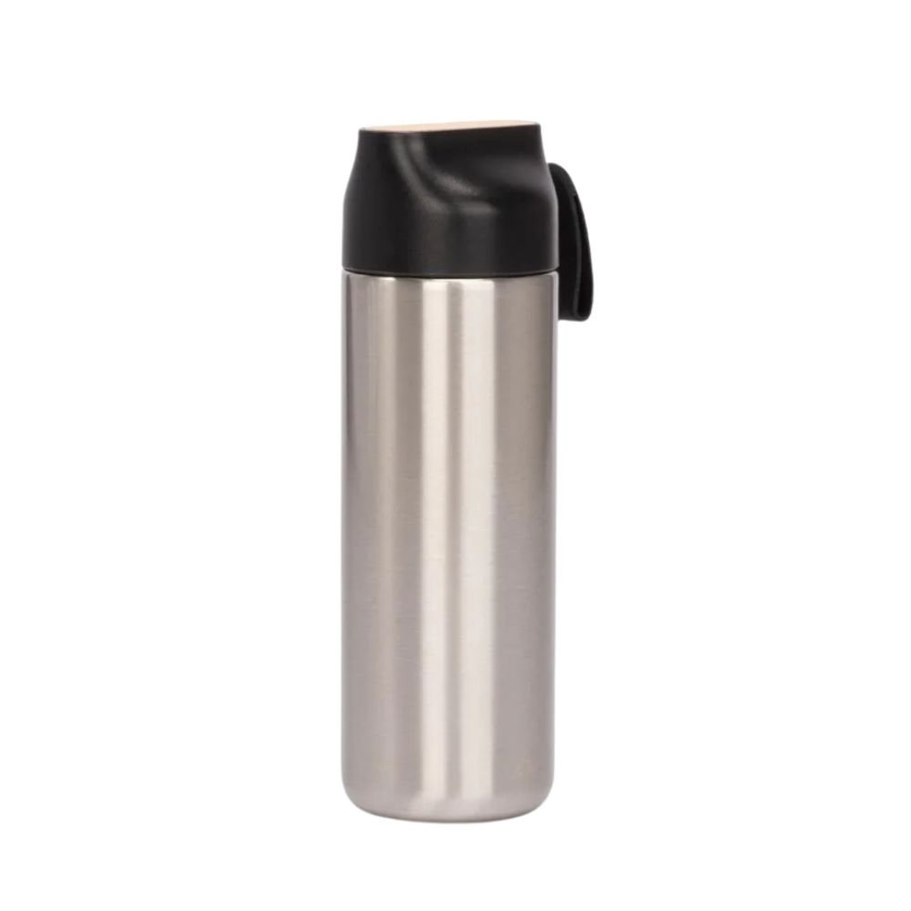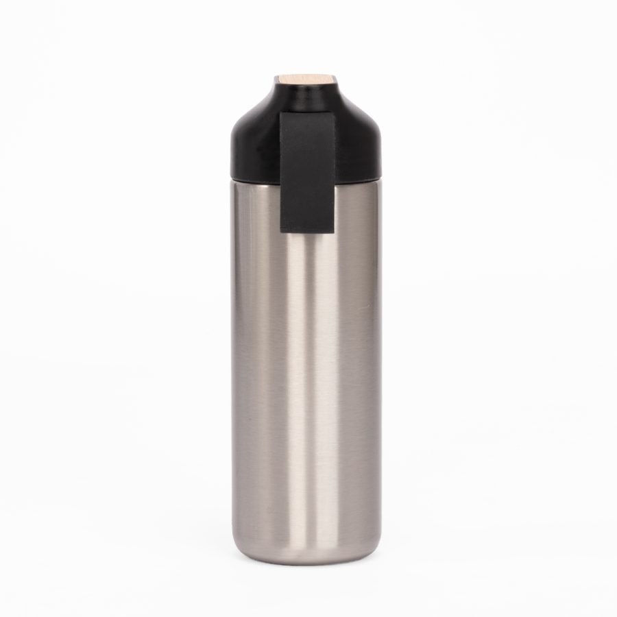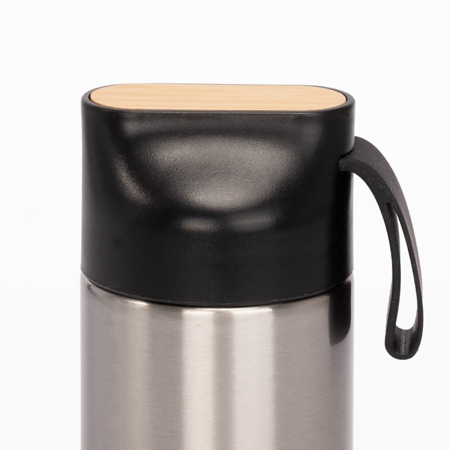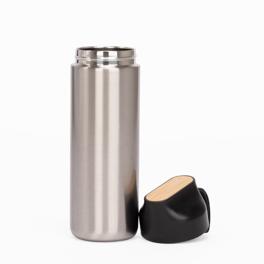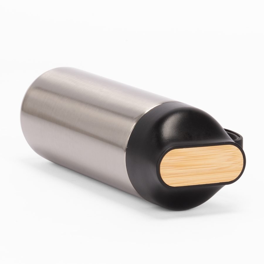 Botella térmica de 600 ml combina resistencia, elegancia y compromiso ambiental en un diseño funcional y moderno. Fabricada en acero inoxidable reciclado con aislamiento de doble pared, mantiene las bebidas frías o calientes por más tiempo, acompañándote durante toda la jornada. Su tapa de plástico negro con detalle de bambú y asa de silicona aporta un toque natural y práctico, ideal para transporte diario. Cuenta con certificaciones FSC y RCS que respaldan su enfoque sostenible. Disponible en color plateado (Silver), tiene un tamaño de 225 x 76 x 76 mm y se presenta en caja individual (94 x 235 x 75 mm). Es apta para personalización mediante DTF, grabado láser o serigrafía, convirtiéndose en una excelente opción promocional para marcas que buscan productos duraderos y con propósito.