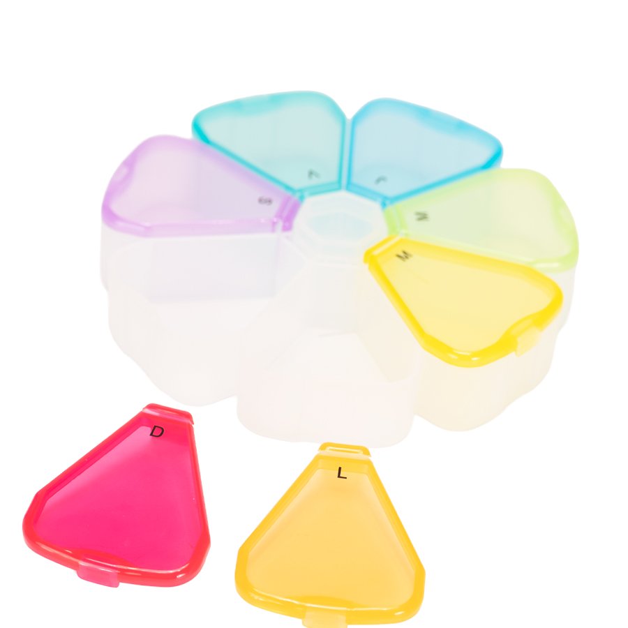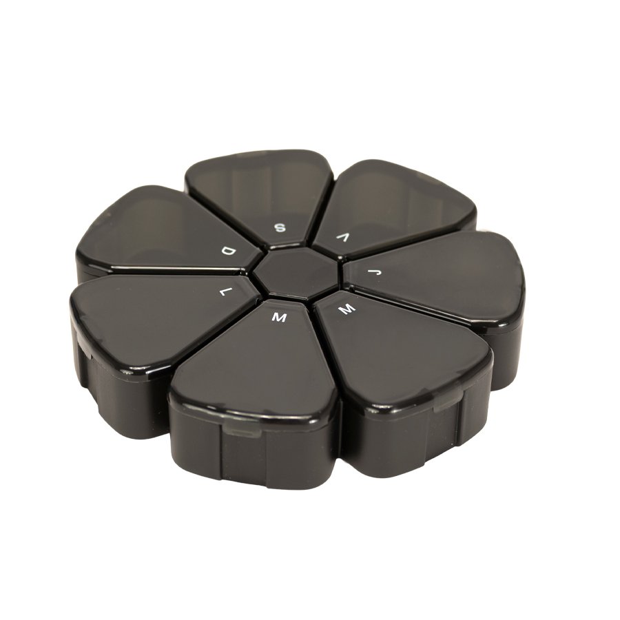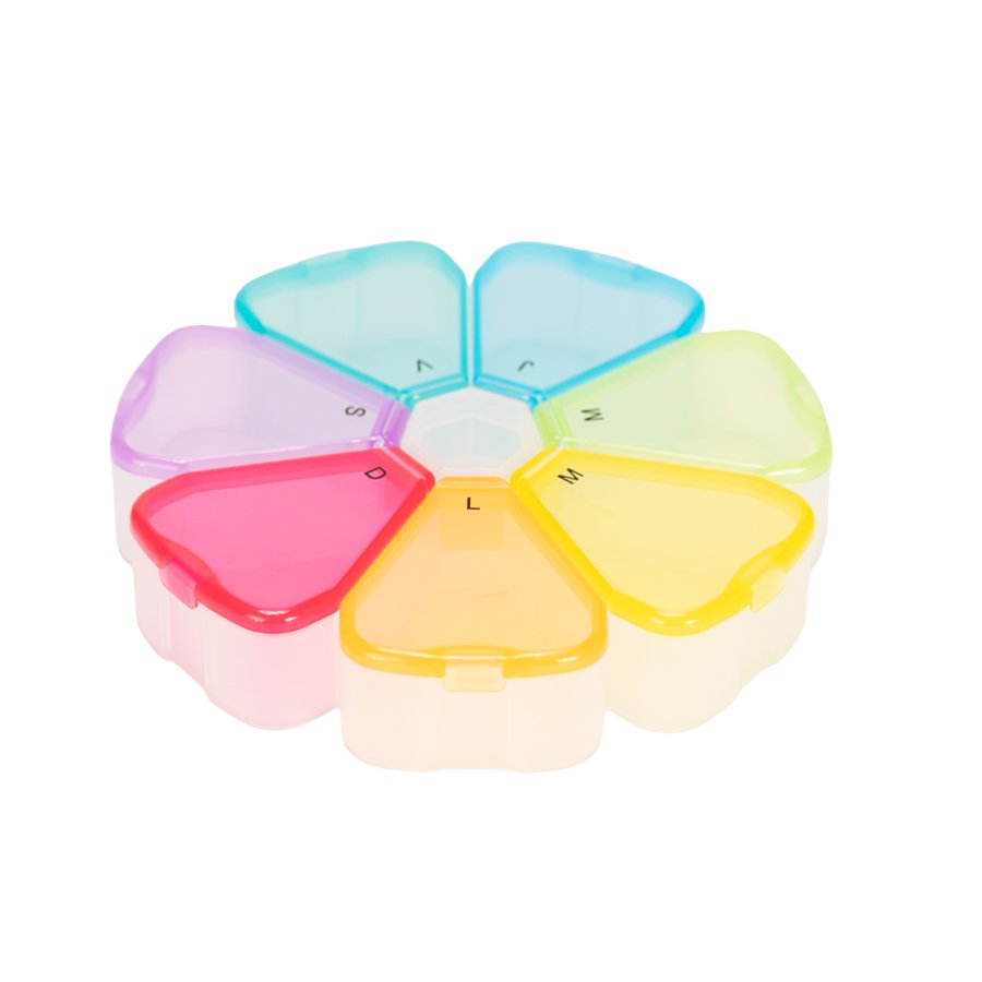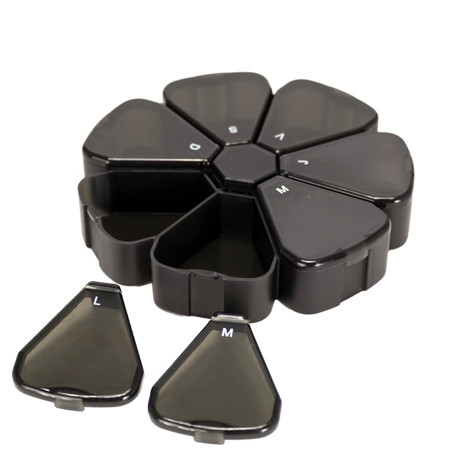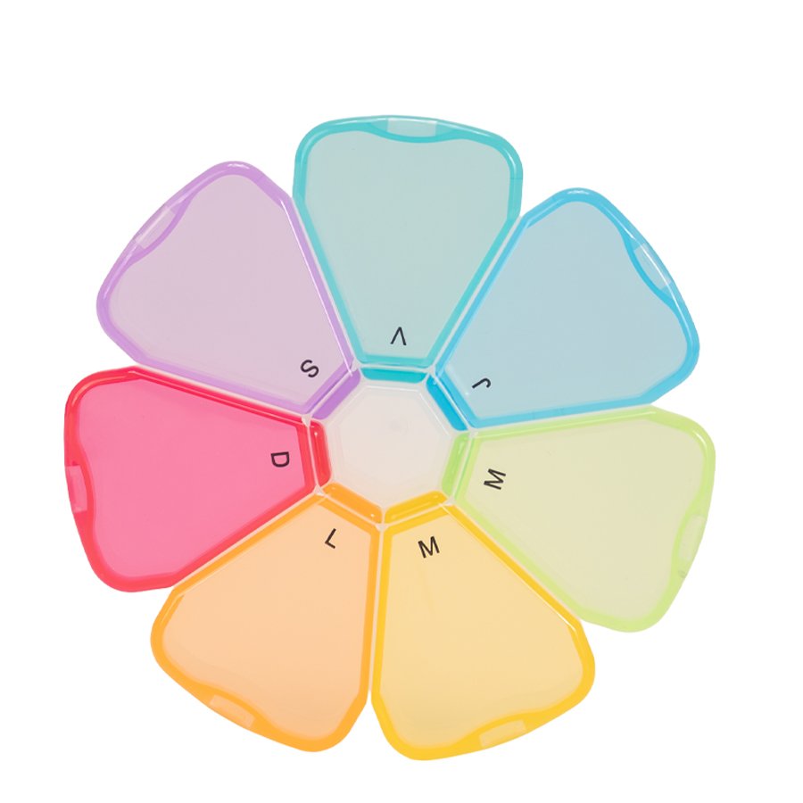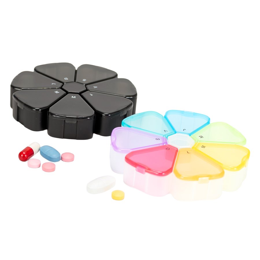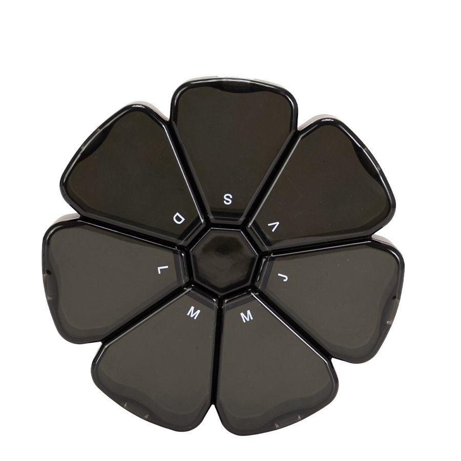 Pastillero plástico , solución práctica y funcional para organizar medicamentos o suplementos diarios, destacando por su atractivo diseño en forma de flor con 7 compartimentos triangulares en colores translúcidos, cada uno identificado con las iniciales de los días de la semana para facilitar su uso; es ideal tanto para uso personal como para fines promocionales, combinando orden y estilo en un solo producto. Fabricado en polipropileno (PP), tiene un tamaño de 12 x 12 x 2,4 cm y un peso de 69 g, y se encuentra disponible en color negro y multicolor.   Además, permite personalización mediante técnicas de serigrafía o DTF, y se entrega en una presentación ecológica que incluye bolsa blanca biodegradable.