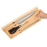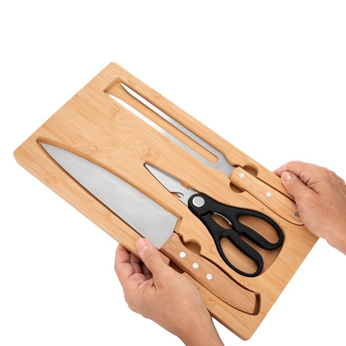 El detalle que se luce en cada asado, este set incluye una tabla de corte de bambú con imán para fijar tres utensilios esenciales: tijera de cocina multiuso de acero con mango plástico, ideal para cortar aves, pescados, vegetales y hierbas, además con abridor de botellas y rompenueces; cuchillo chef de acero con mango de madera; y tenedor de acero con mango de madera. Las medidas de los utensilios son: tijera 19,5 x 8,5 cm (73 g), cuchillo 33,5 x 4,5 cm (107 g) y tenedor 30,5 x 3 cm (84 g). Fabricado con materiales de calidad como bambú, imán, acero inoxidable 420, madera y plástico, este set combina funcionalidad, durabilidad y estilo, convirtiéndose en el accesorio perfecto para cualquier asado.